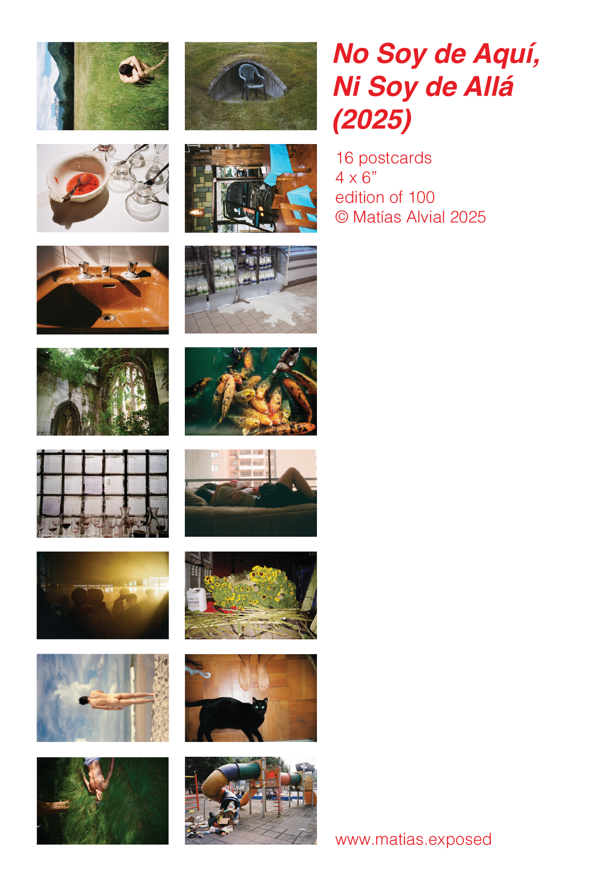“No Soy de Aquí, Ni Soy de Allá” is a meditation on belonging and change. Through sixty postcards and fragments of journal entries, the artist retraces the places he has wandered — searching for a home during visa issues. Having lived half his life in Chile and half in the U.S., his identity drifts between languages and places, between who he was and who he is becoming. These images and words are an attempt to reconcile that in-between space—to find unity in duality, and to understand that home is not a location, but the connections that anchor us.
